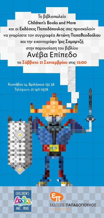 Το βιβλιοπωλείο Children’s Books and More και οι Εκδόσεις Παπαδόπουλος σας προσκαλούν να γνωρίσετε τον συγγραφέα Αντώνη Παπαθεοδούλου και την εικονογράφο Ίριδα Σαμαρτζή, στην παρουσίαση του βιβλίου τους Ανέβα Επίπεδο, το Σάββατο 21 Σεπτεμβρίου στις 12:00 μ.μ.
