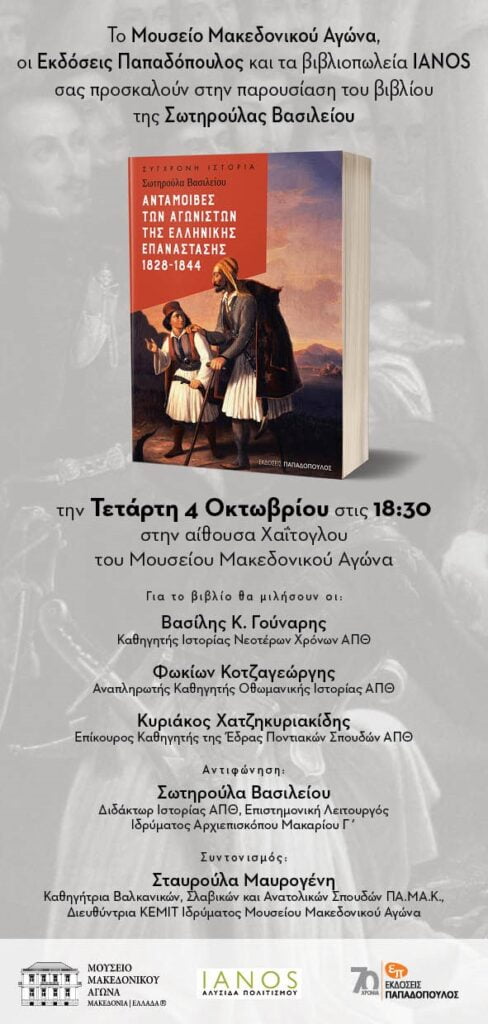 Το Μουσείο Μακεδονικού Αγώνα, οι Εκδόσεις Παπαδόπουλος και τα βιβλιοπωλεία IANOS σας προσκαλούν στην παρουσίαση του βιβλίου της Σωτηρούλας Βασιλείου