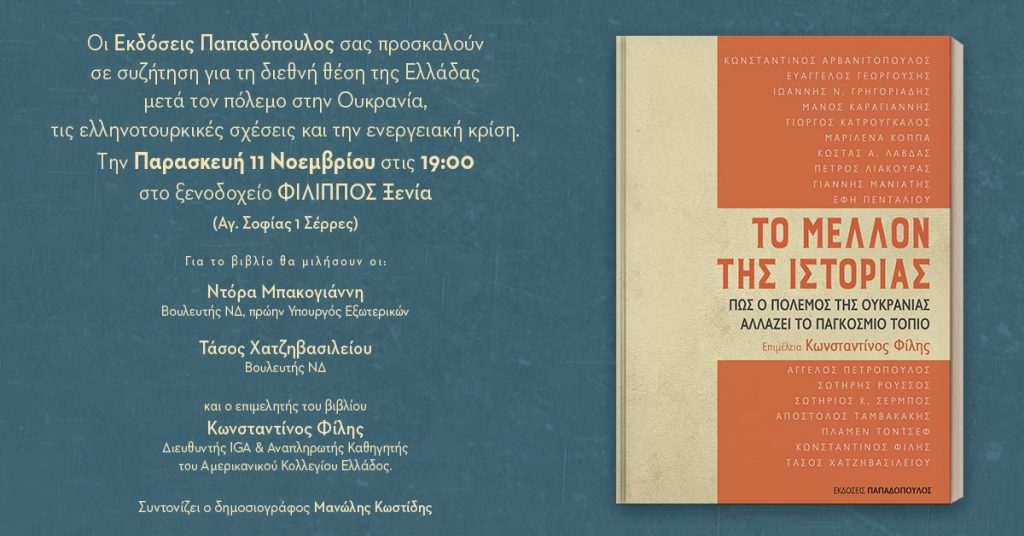 Οι Εκδόσεις Παπαδόπουλος σας προσκαλούν σε συζήτηση για τη διεθνή θέση της Ελλάδας μετά τον πόλεμο στην Ουκρανία, τις ελληνοτουρκικές σχέσεις και την ενεργειακή κρίση.