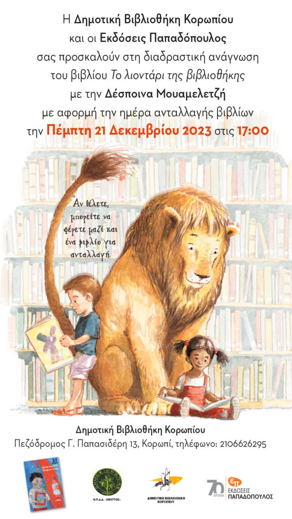 Η Δημοτική Βιβλιοθήκη Κορωπίου και οι Εκδόσεις Παπαδόπουλος σας προσκαλούν στη διαδραστική ανάγνωση του βιβλίου Το λιοντάρι της βιβλιοθήκης με την Δέσποινα Μουαμελετζή με αφορμή την ημέρα ανταλλαγής βιβλίων την Πέμπτη 21 Δεκεμβρίου 2023 στις 17:00