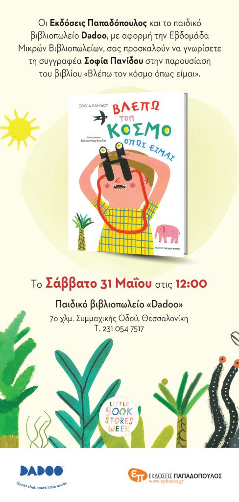 Οι Εκδόσεις Παπαδόπουλος και το παιδικό βιβλιοπωλείο Dadoo, με αφορμή την Εβδομάδα Μικρών Βιβλιοπωλείων, σας προσκαλούν να γνωρίσετε την συγγραφέα Σοφία Πανίδου στην παρουσίαση του βιβλίου Βλέπω τον κόσμο όπως είμαι, το Σάββατο 31 Μαΐου στις 12:00.